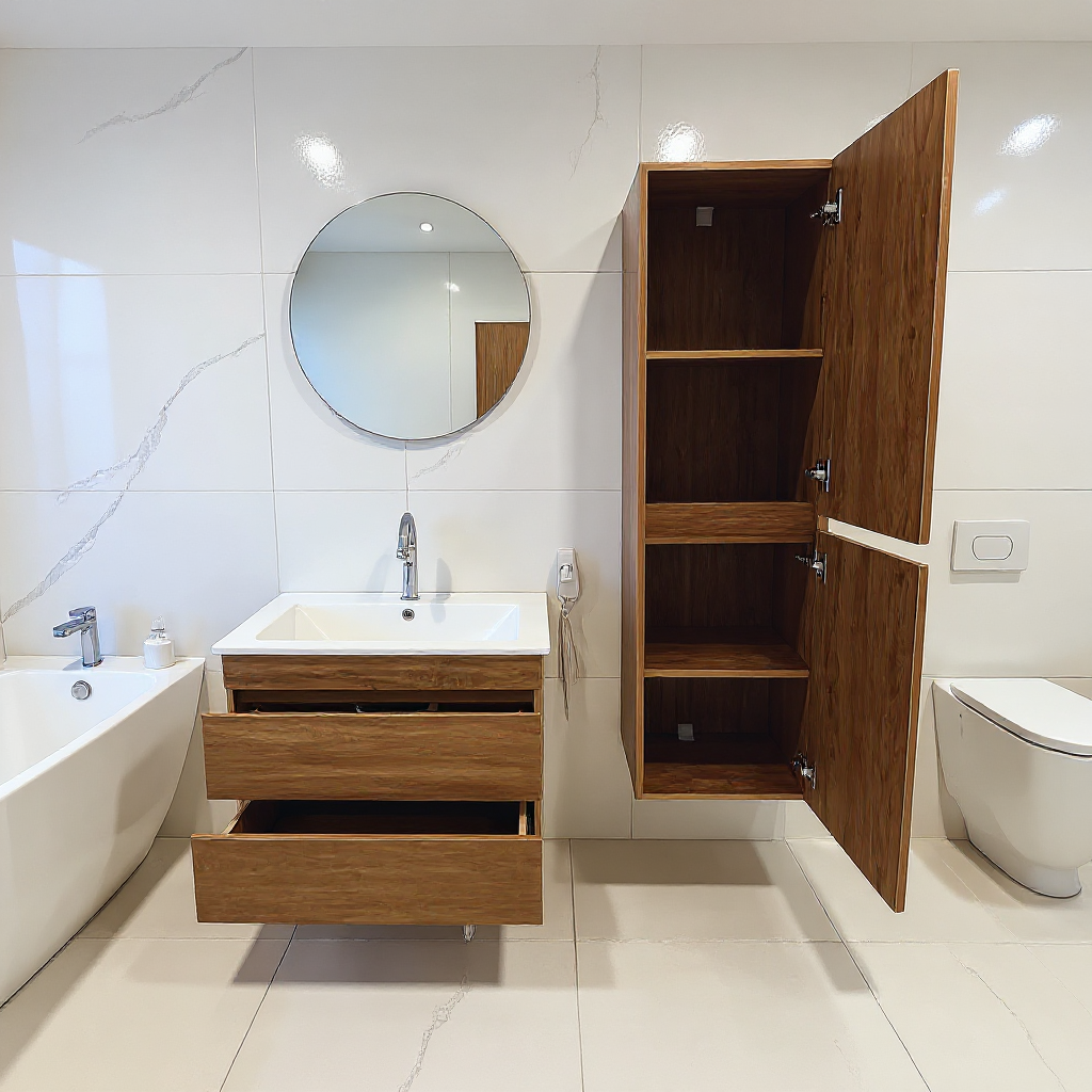 Tvättställsskåpets lådor har mjukstängande funktion och de integrerade handtagen ger ett minimalistiskt intryck. Spegelskåpet och högskåpet erbjuder gott om extra förvaring och kompletterar helhetsdesignen.