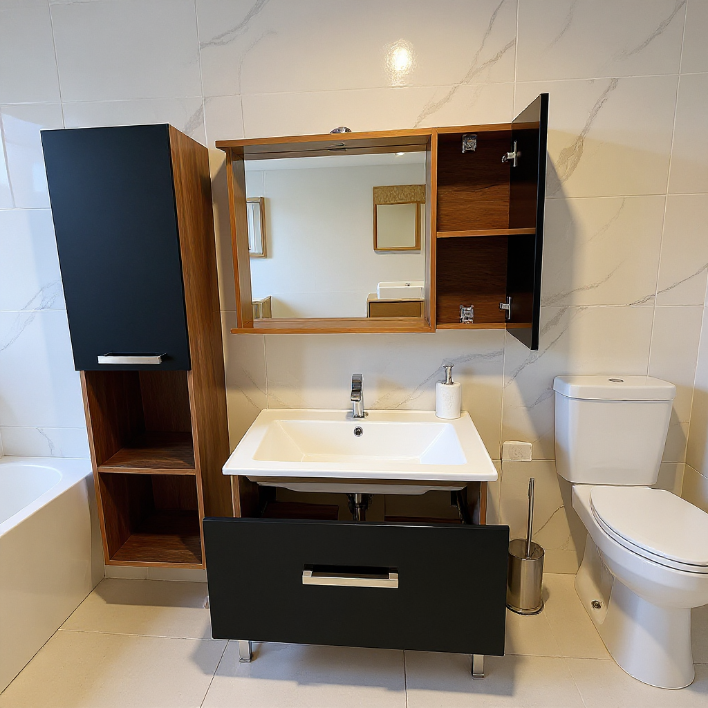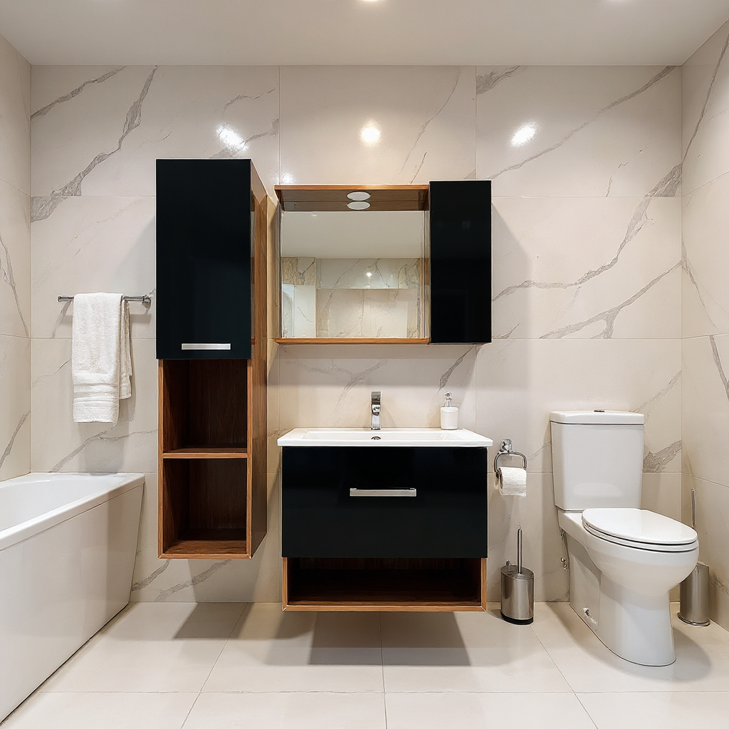 Serien består av tvättställsskåp, överskåp och högskåp, vilket skapar en komplett och praktisk lösning. Tvättställsskåpet har ett elegant ovanpåliggande porslinstvättställ och PVC-materialets hållbarhet säkerställer långvarig användning.
